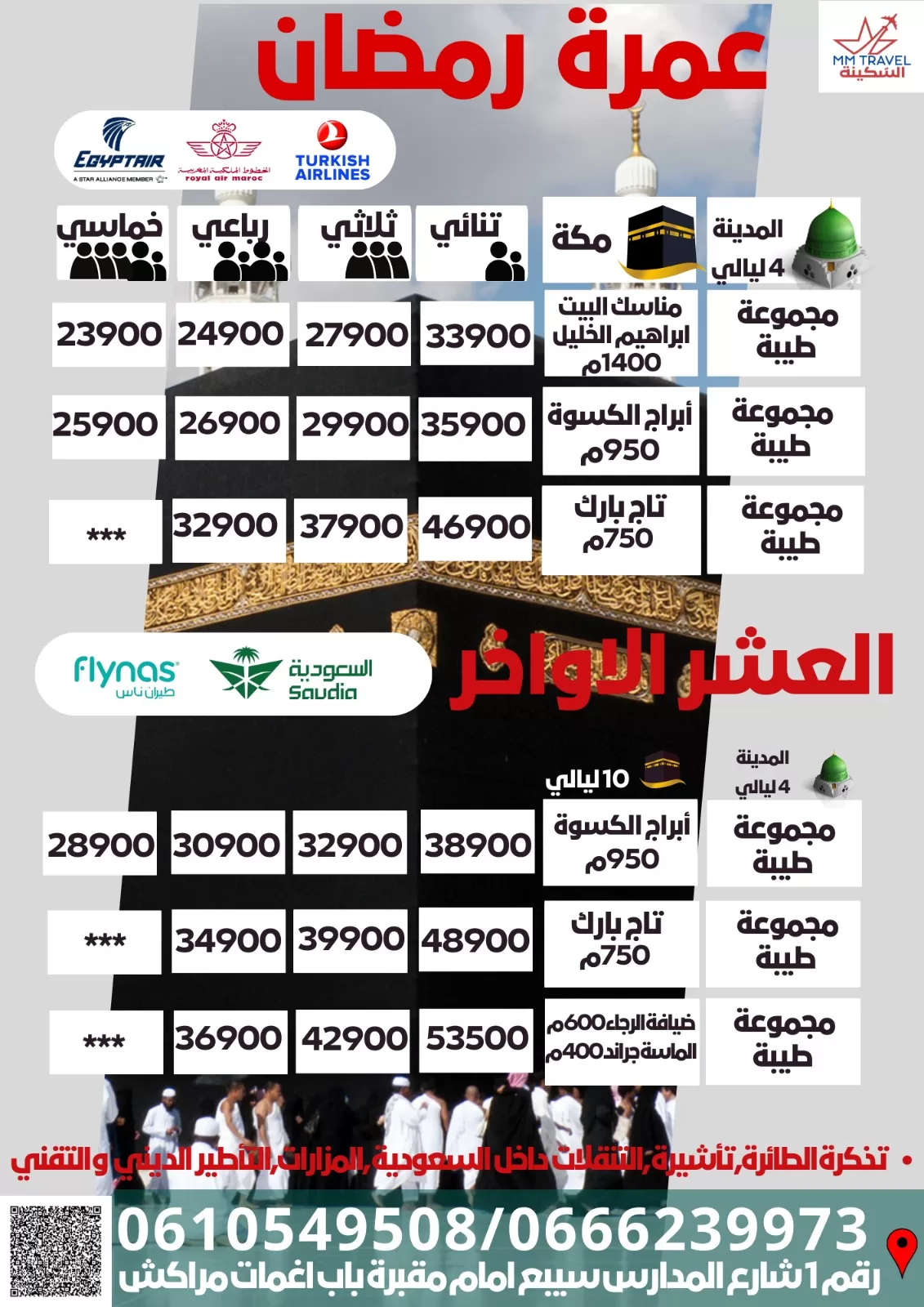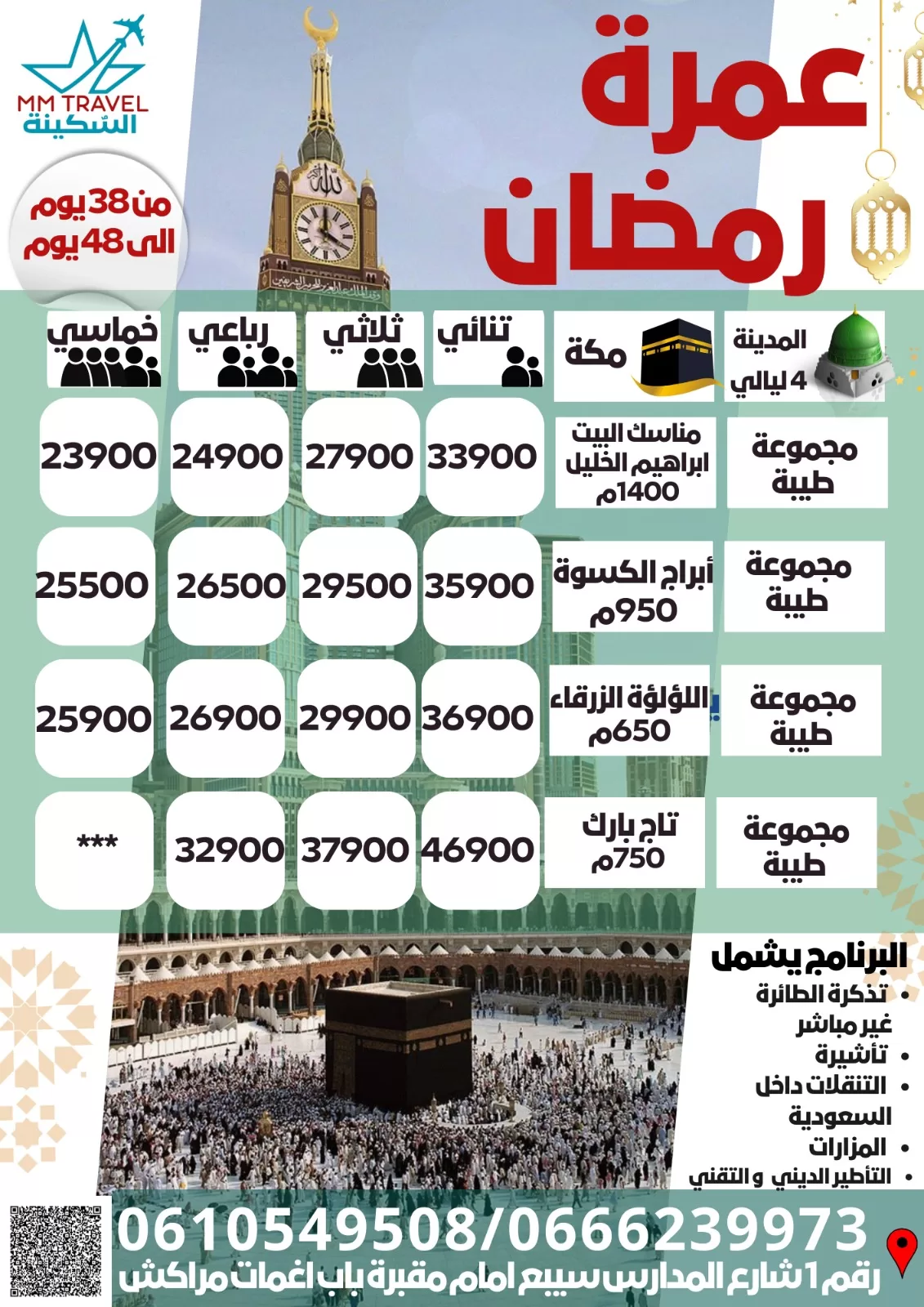 لدينا الفخر بتقديم لكم، خبير الرحلات الدينية للعمرة في المغرب. بخبرتنا التي تمتد لأكثر من 14 عامًا في مرافقة الحجاج، نحن هنا لنقدم لكم الدعم في كل مرحلة من رحلتك المقدسة. مهمتنا هي توفير رحلة عمرة تجمع بين الهدوء والسكينة، مما يتيح لكم التركيز على التفاني والروحانية. نحن نأخذ على عاتقنا كل التفاصيل، من الرحلات الجوية المريحة إلى الإقامة ذات الجودة العالية، مرورًا بالمزارات الثقافية والتاريخية في المواقع المقدسة